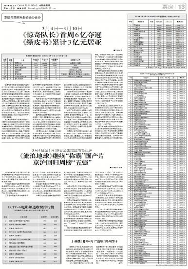 - 《惊奇队长》首周6亿夺冠 《绿皮书》累计3亿元居亚
