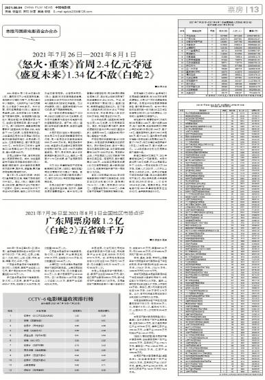 - 《怒火·重案》首周2.4亿元夺冠 《盛夏未来》1.34亿不敌《白蛇2》