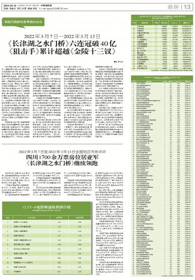 2022年3月7日至3月13日(第10周),全国电影票房排名上半区的十五省市依次为:广东、四川、江苏...