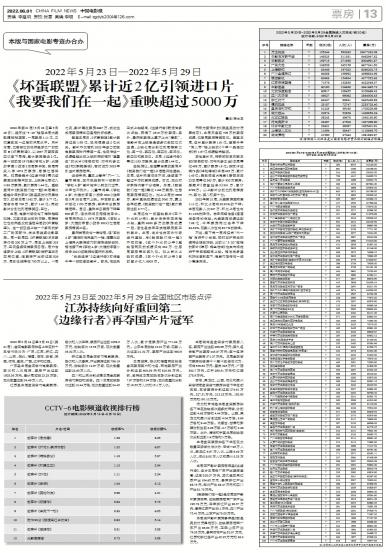 2022年5月16日至5月22日(第21周),全国电影票房排名上半区的十五省市依次为:广东、江苏、浙...