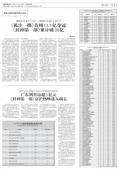 2023年第32周(8月7日至8月13日),本周继续有高口碑作品接档,大盘攀升至暑期档新高,一周成绩...