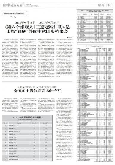 2023年第38周(9月18日至9月24日),本周没有大体量新片上映,大盘继续下滑。一周七天,电影市...