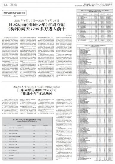6月10日至6月16日(第24周),全国电影票房排名上半区的十五省市依次为:广东、江苏、浙江、上海、四川、北京、山东、湖北、河南、安徽、湖南、福建、辽宁、河北、陕西。