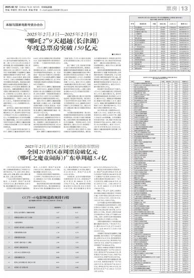 2月3日至2月9日(2025年第6周),全国电影票房排名上半区的十五省市依次为:广东、江苏、四川、浙...