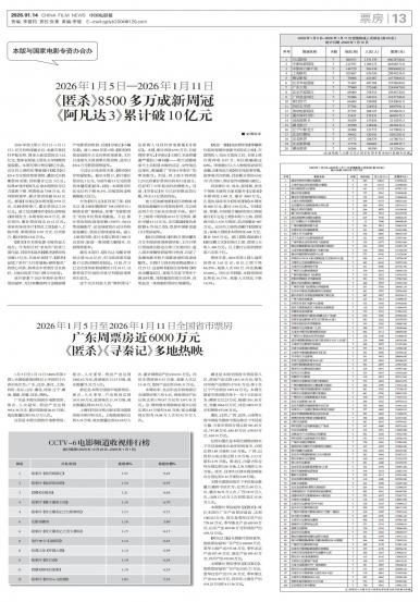 1月5日至1月11日(2026年第2周),全国电影票房排名上半区的十五省市依次为:广东、江苏、浙江、...