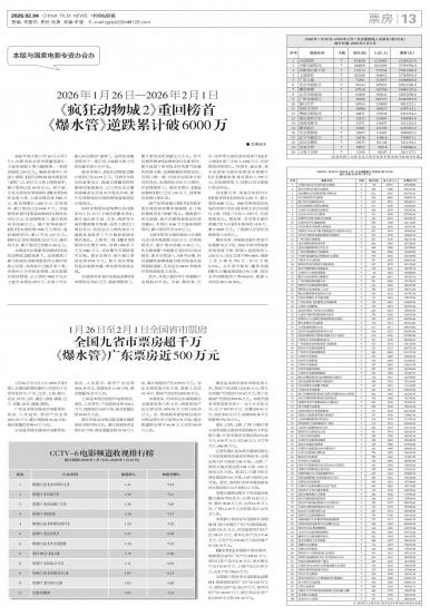 1月26日至2月1日(2026年第5周),全国电影票房排名上半区的十五省市依次为:广东、江苏、上海、...